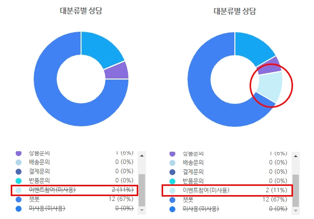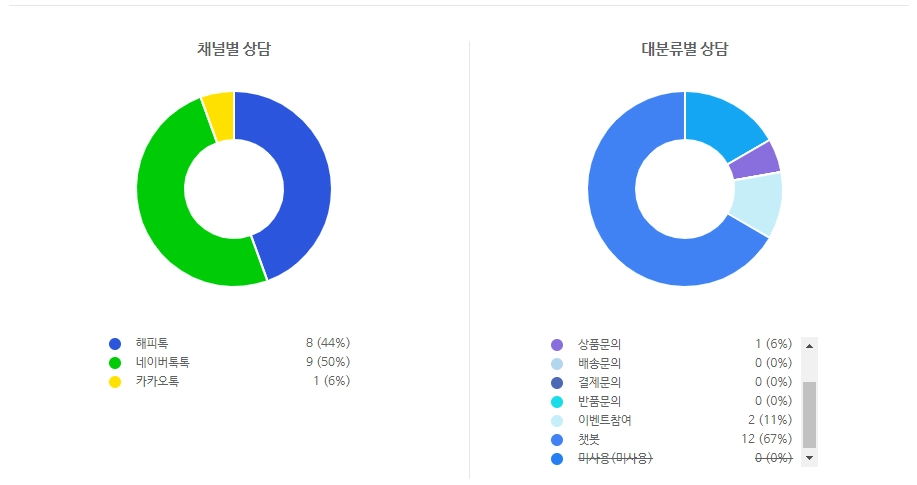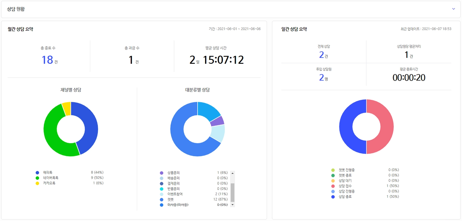 즉, 챗봇 및 채팅 상담 현황의 숫자와 일간 상담 요약의 숫자는 일치하지 않을 수 있는데요.