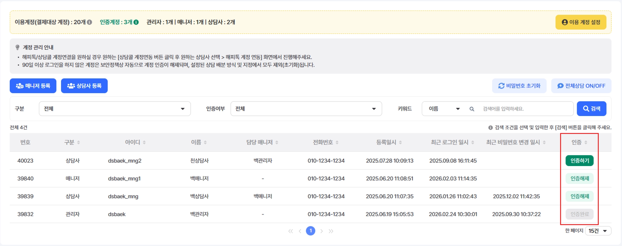 관리자 권한으로 모든 매니저 및 상담사의 비밀번호를 동일하게 변경할 수 있습니다.