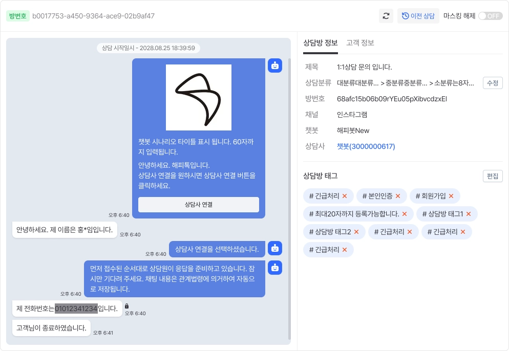 상담을 요청한 고객의 정보를 표시하며, 고객 태그를 편집할 수 있습니다. 고객 개인정보는 마스킹 처리되어 표시되며, 마스킹 해제 ON시 원문이 표시됩니다.