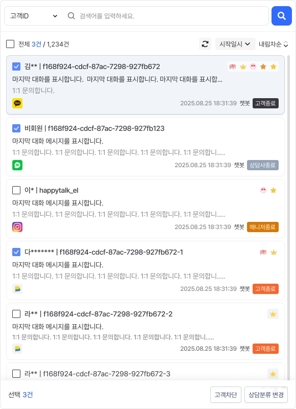 여러 상담방을 동시에 선택하여 상담 종료, 고객차단, 상담사 배정 업무를 처리합니다.