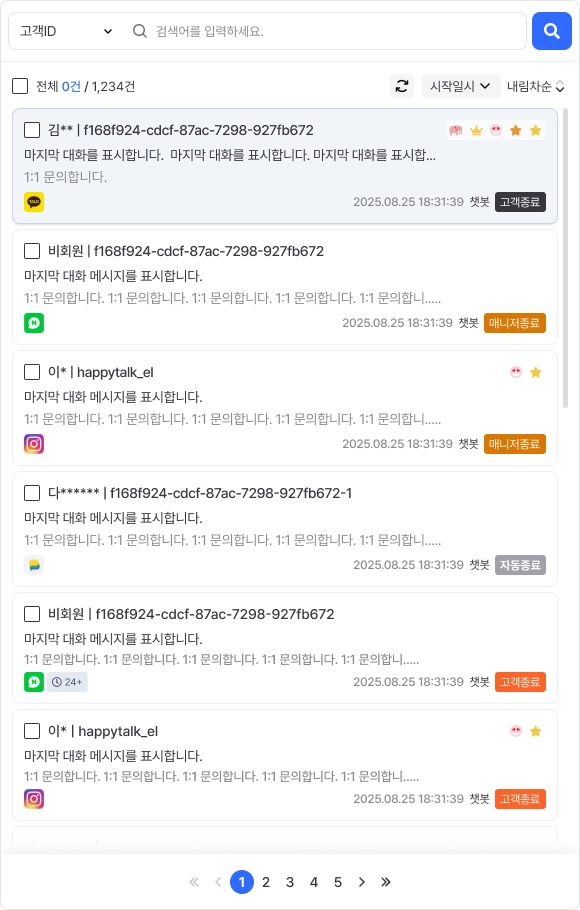 챗봇에서 종료된 상담방 목록이 표시되며, 고객 정보 및 상담방 데이터를 다양한 키워드로 검색할 수 있습니다.
