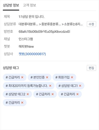 상담방의 상담 정보를 표시하며, 상담방 태그를 편집할 수 있습니다.