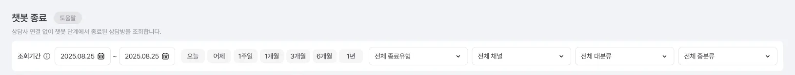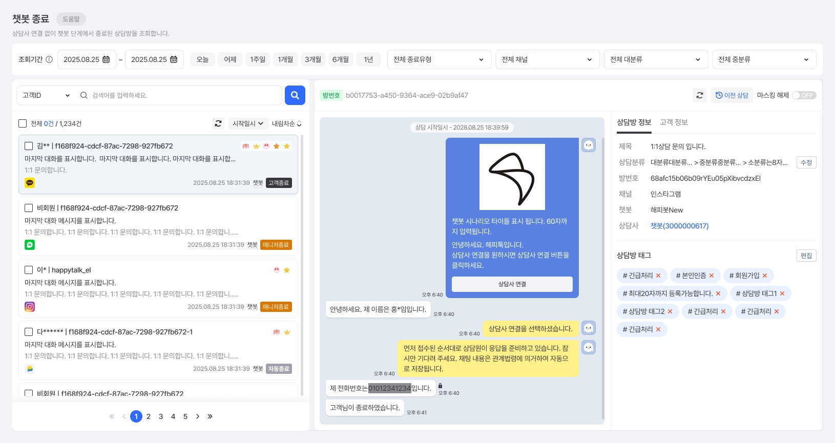 챗봇 종료는 고객과 해피봇(이하 챗봇) 간의 대화가 상담사 연결 없이 종료된 상담방을 확인하고, 고객차단/상담분류 변경을 처리할 수 있는 메뉴입니다. 고객 종료, 상담사 종료, 매니저 종료, 자동 종료 기준으로 상담 내역을 조회할 수 있습니다. 챗봇을 사용하는 경우에만 메뉴를 사용할 수 있습니다.