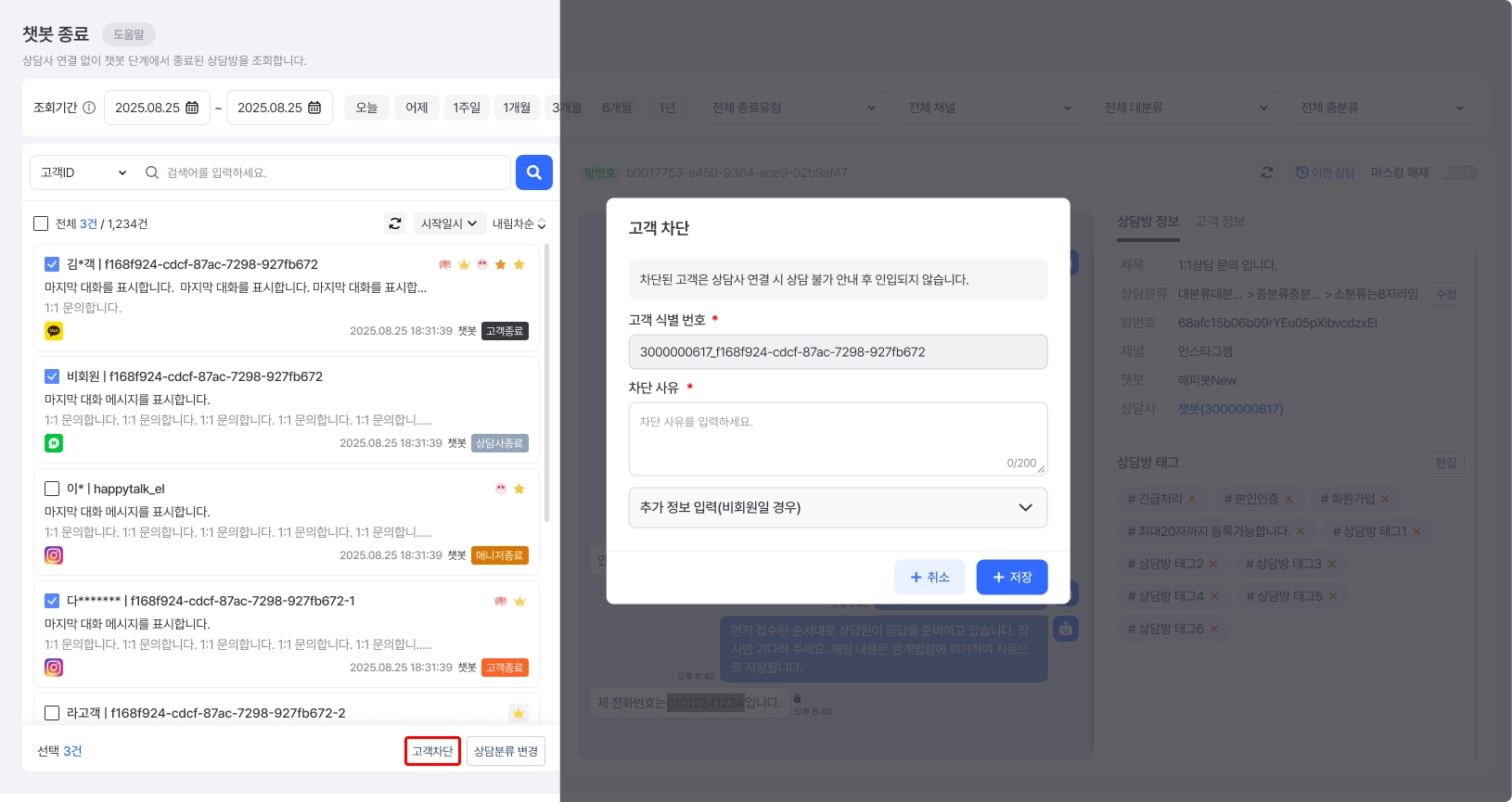 챗봇 상담 내용을 확인 후 비정상적이거나 반복적인 문의, 스팸 메시지, 욕설 등 운영에 방해되는 대화한 고객을 차단합니다.