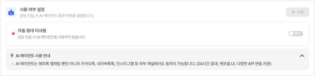 최초 접속 시에는 OFF 상태 이며, ON으로 변경 후 저장해야 AI 에이전트가 동작합니다.
