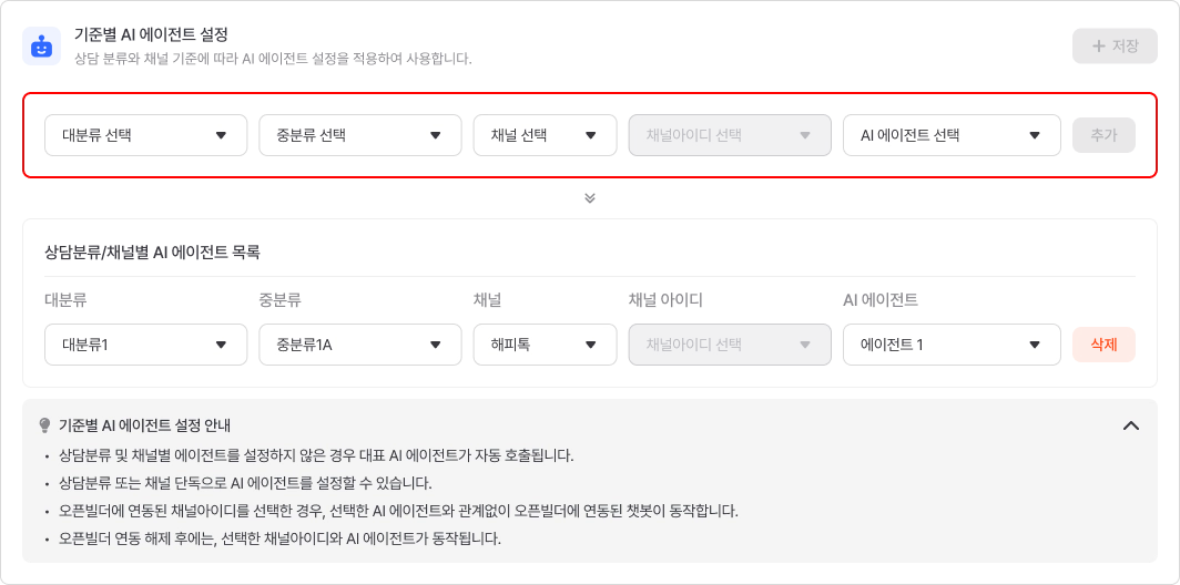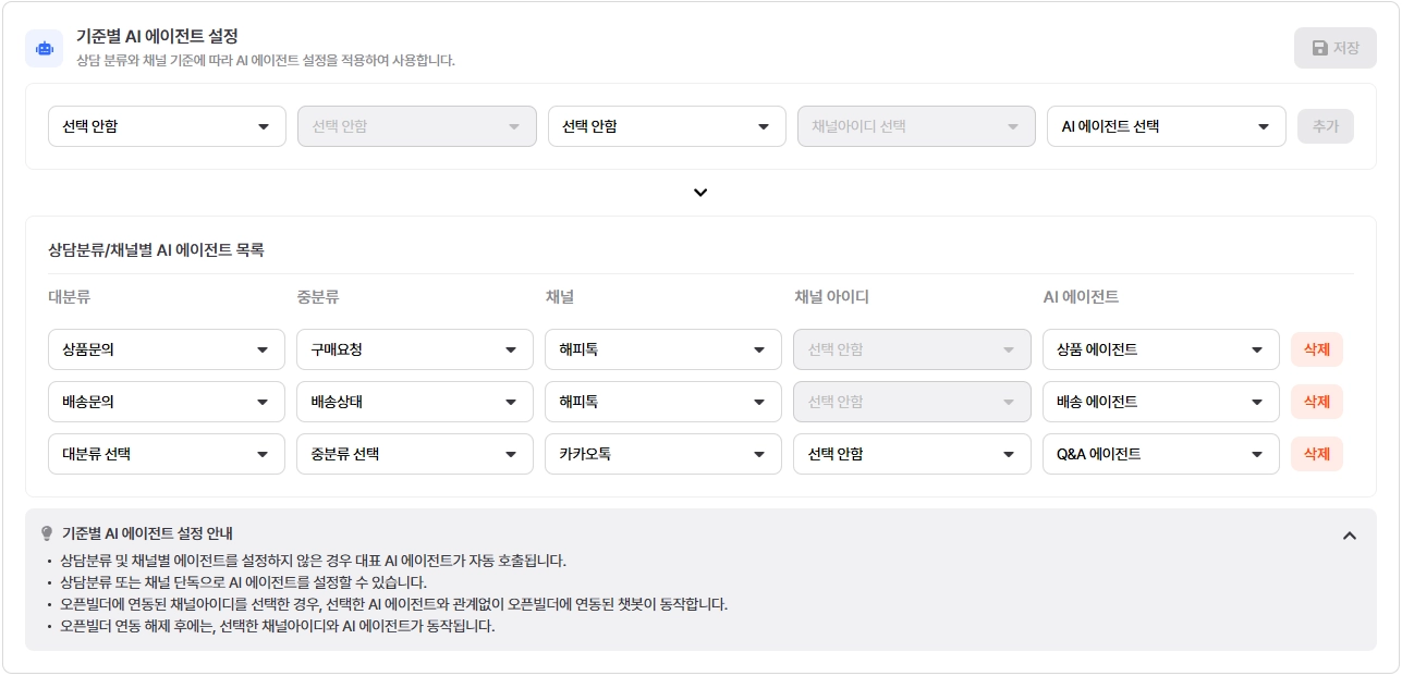 선택한 조건에 따라 해당 상담 분류 또는 채널에서 지정된 AI 에이전트가 동작합니다.