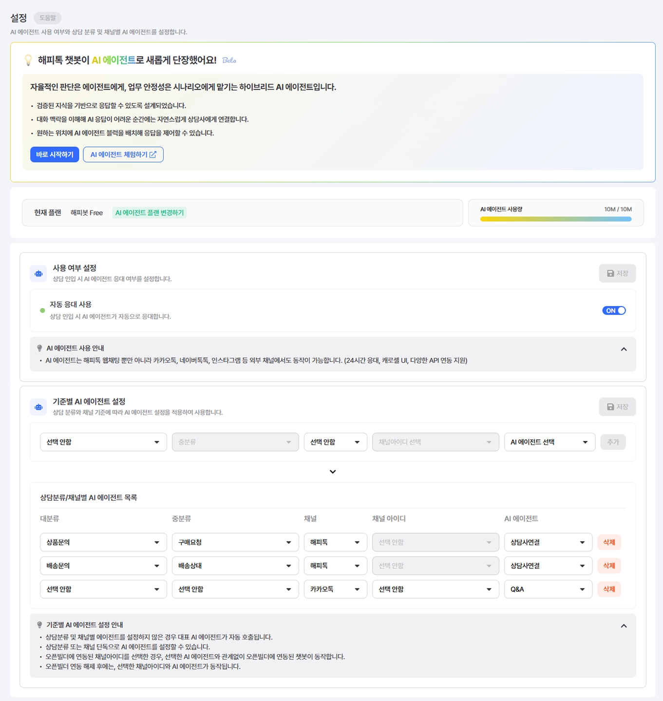 상담 분류 및 채널 기준에 따라 여러 개의 AI 에이전트를 설정하고 운영할 수 있는 기능입니다.