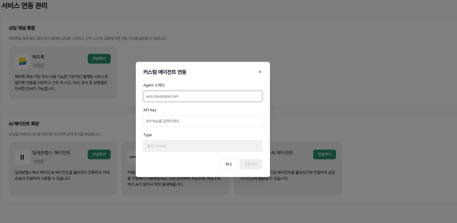 콜브릿지 설정 > 서비스 연동 관리 화면에서 커스텀 에이전트 연동 메뉴를 통해 아래 정보를 입력합니다.
