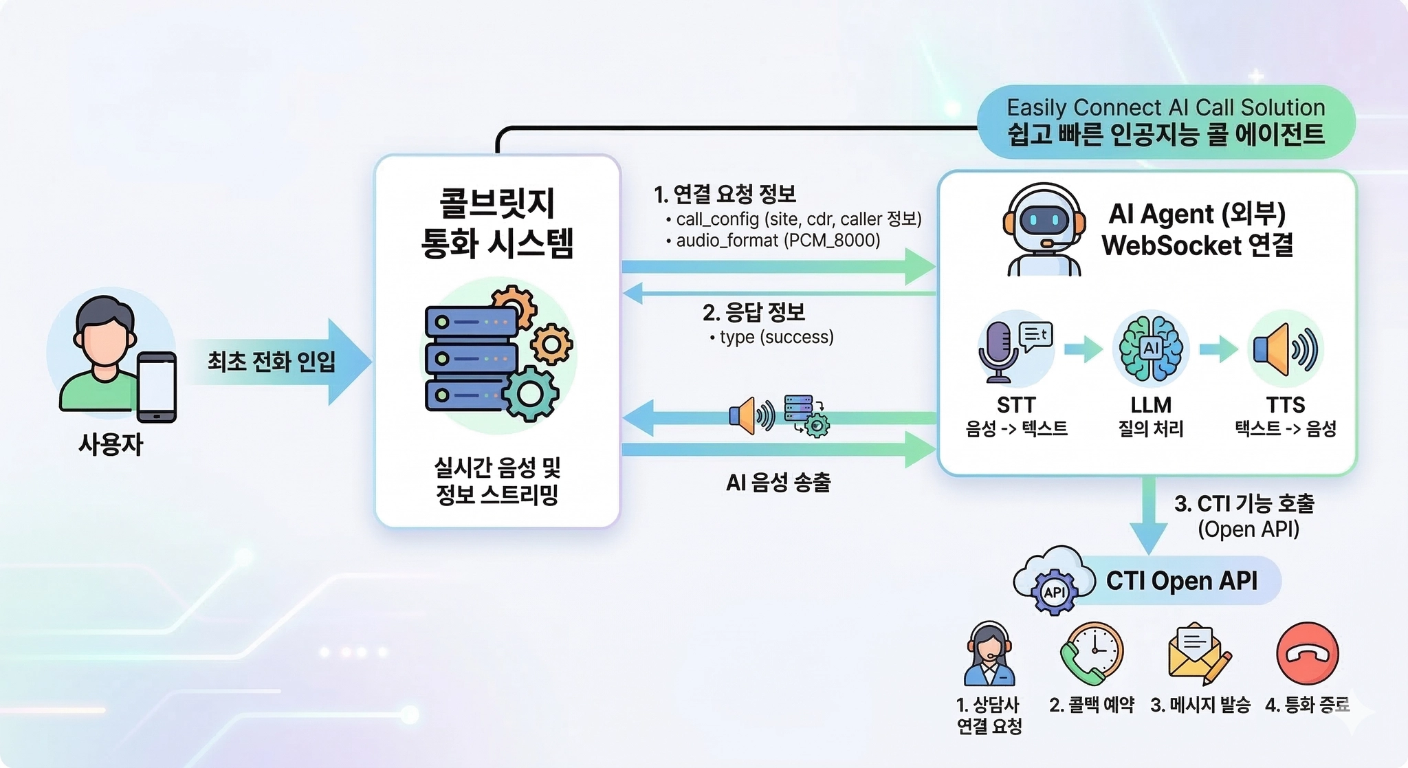콜브릿지는 외부 AI Agent 시스템과 WebSocket 기반으로 연동할 수 있습니다.