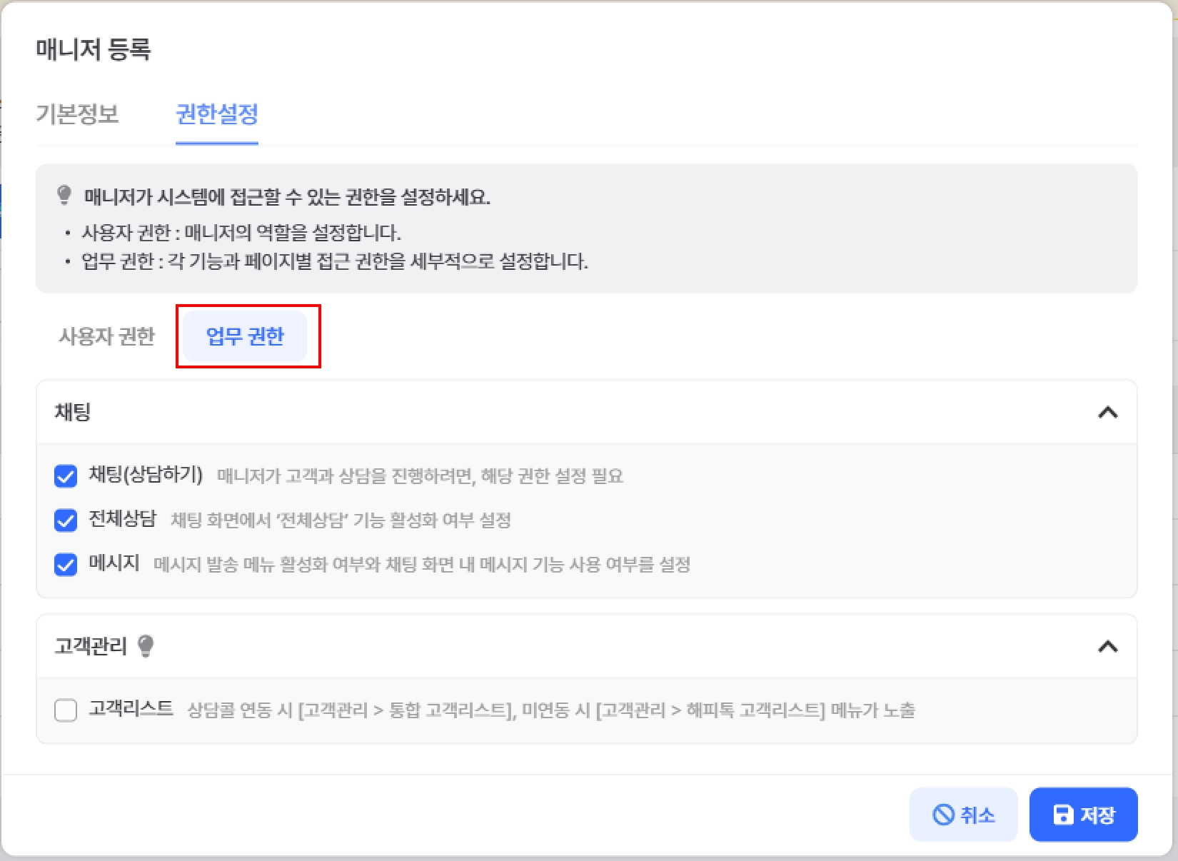 기본적으로 상담관리 및 고객상담 관련 기능 접근 가능