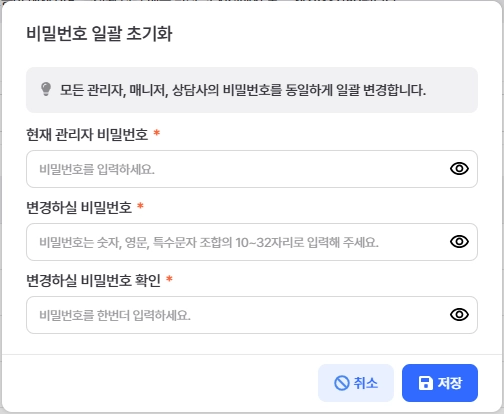 관리자 권한으로 모든 매니저 및 상담사의 비밀번호를 동일하게 변경할 수 있습니다.