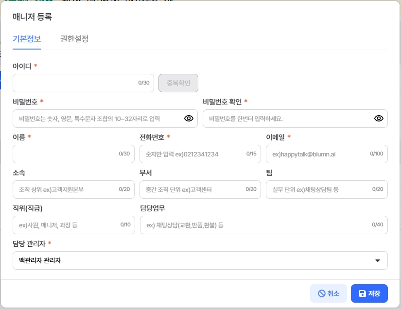 이 화면에서는 매니저 또는 상담사 계정을 등록할 수 있습니다.
