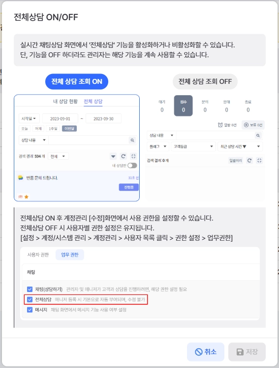전체상담 ON 이후, 사용자별 업무 권한에서 추가로 허용해야 실제 사용이 가능합니다.