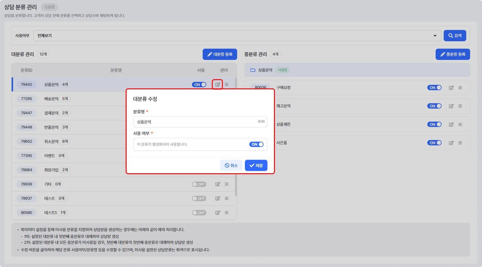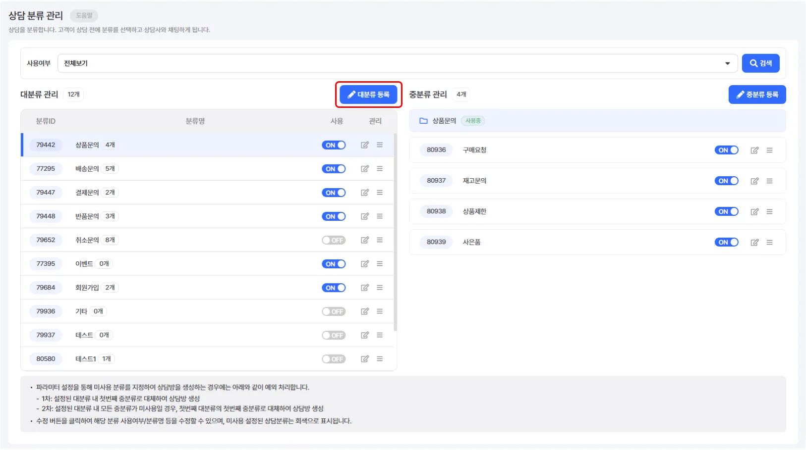 예를 들어 '상품문의' 대분류 하위에는 구매요청/재고문의/상품제안/사은품을 중분류로 설정할 수 있습니다.