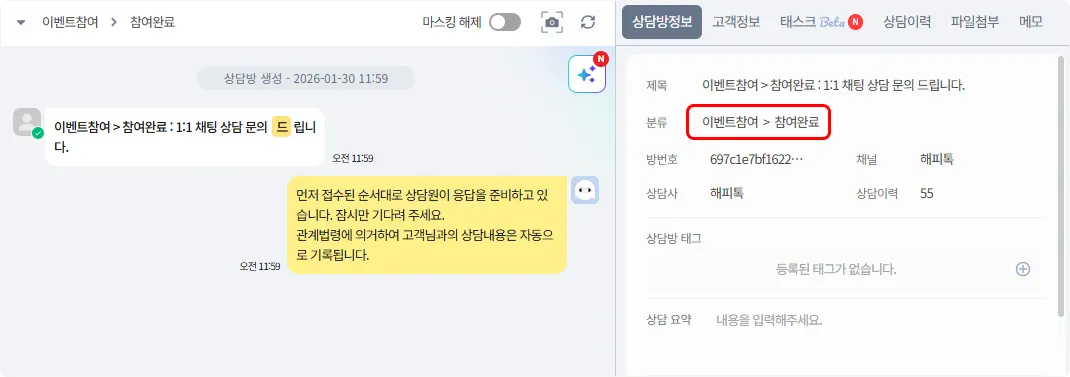 해당 스크립트가 삽입된 페이지의 채팅 버튼을 클릭하여 인입 시 상담사가 상담 분류를 변경해 주지 않아도 자동으로 [이벤트 참여/참여완료] 상담 분류로 설정된 것을 확인할 수 있습니다.