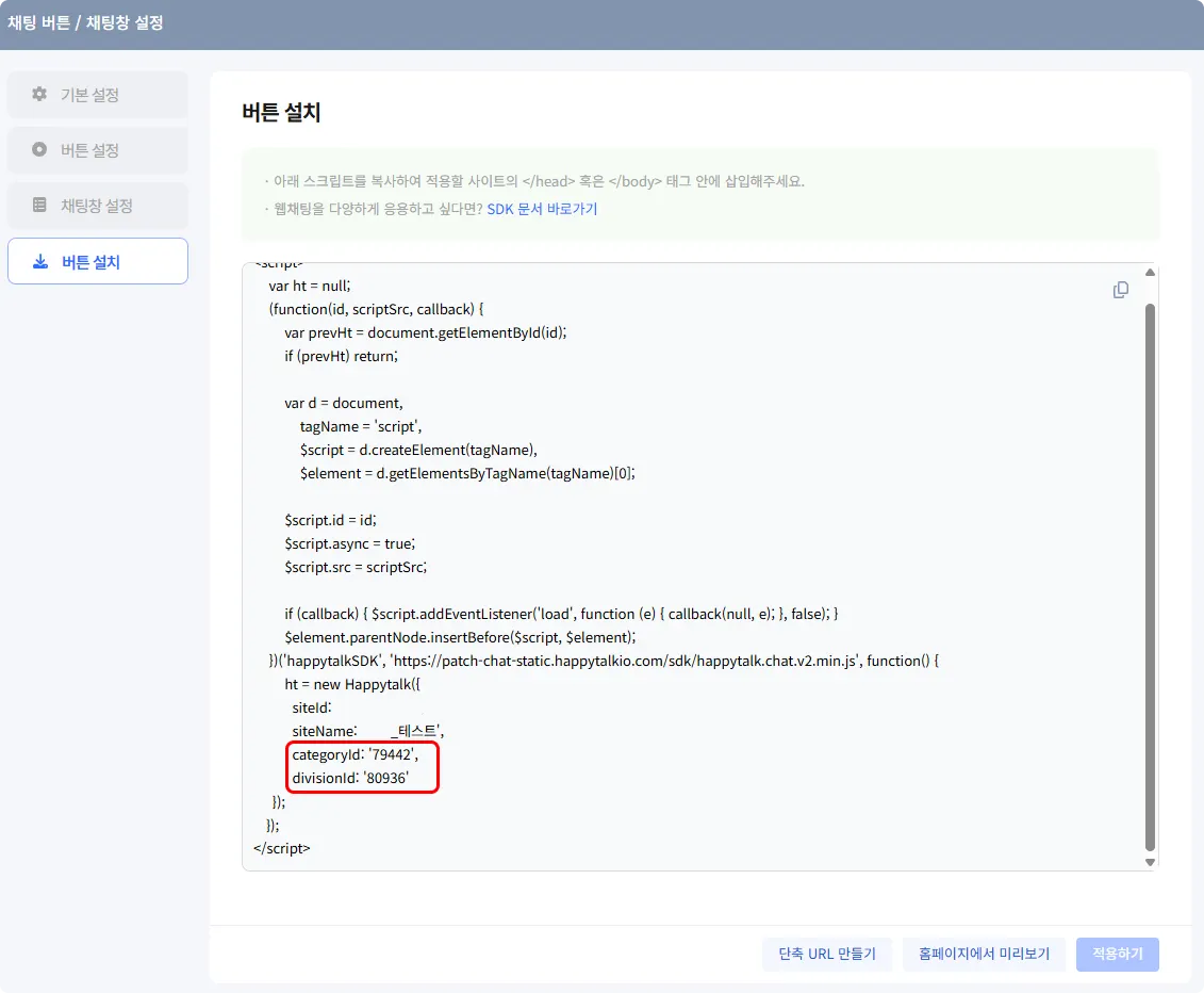 이 URL에 상담 분류 고유번호를 구분하여 해당 URL을 통해 고객 인입 시 상담 분류가 자동으로 설정되도록 사용할 수 있습니다.