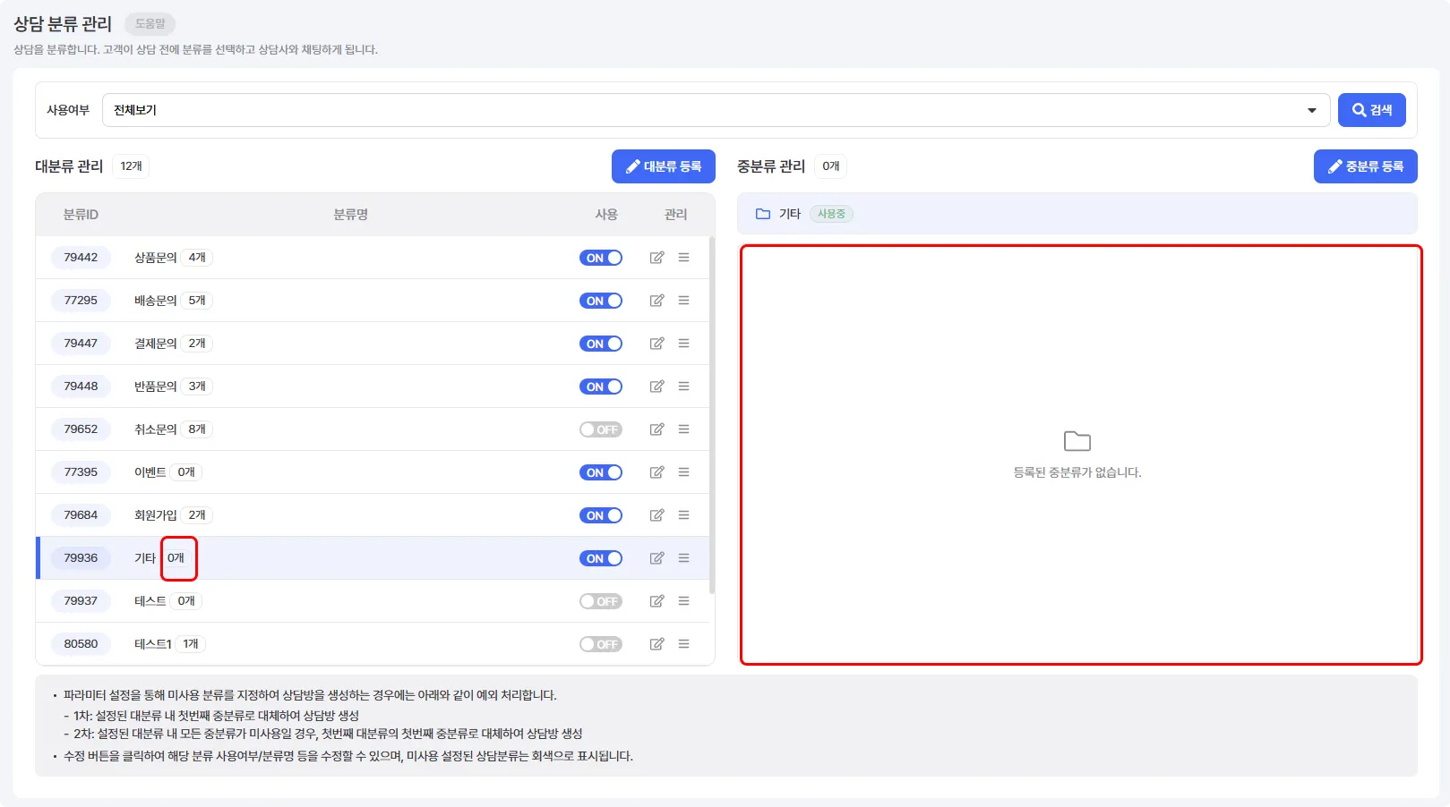 중분류가 없는 대분류는 상담 분류 변경 시 확인할 수 없습니다.