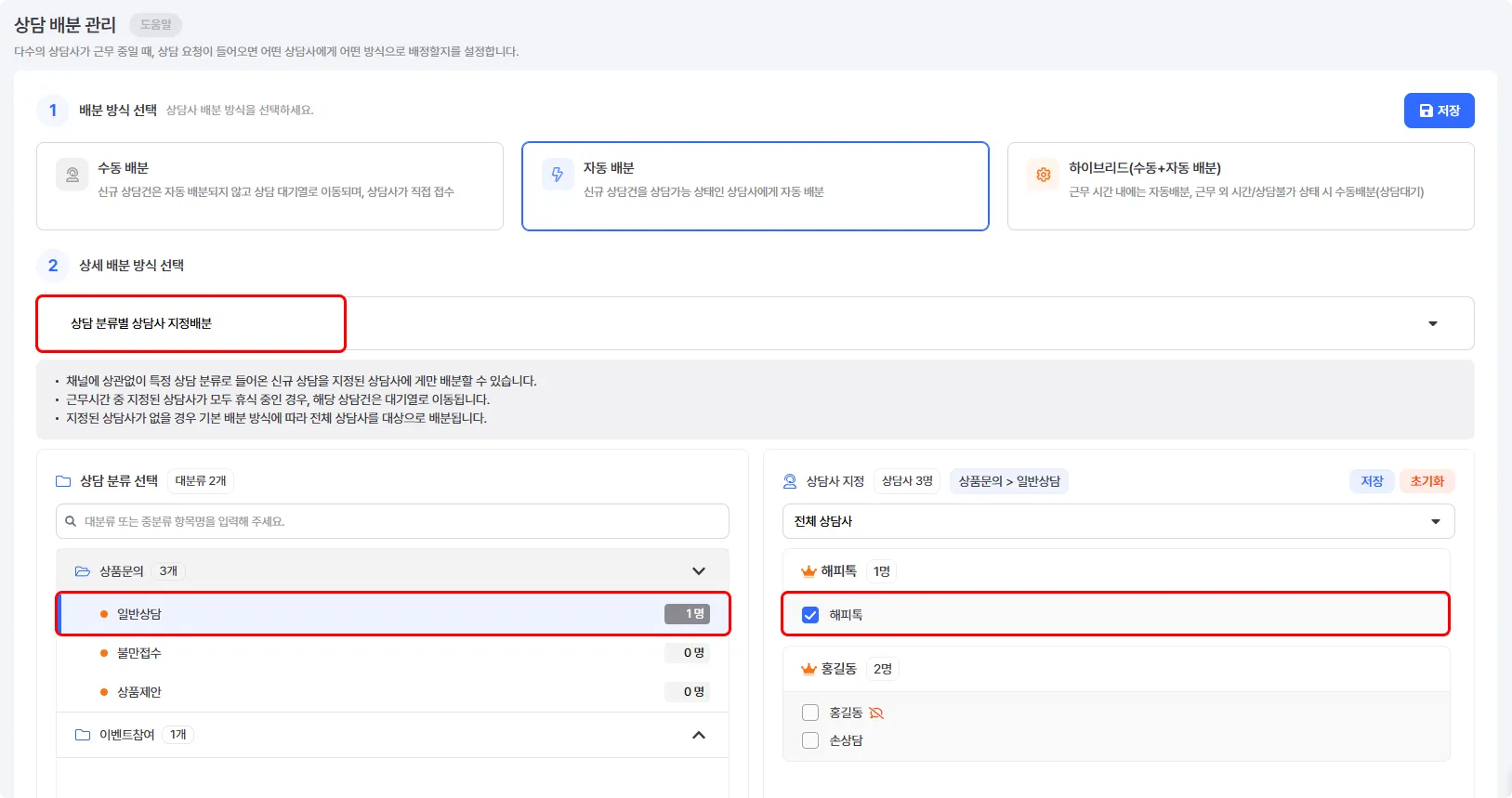[자동배분] / [상담 분류별 상담사 지정배분]으로 설정할 수 있습니다.