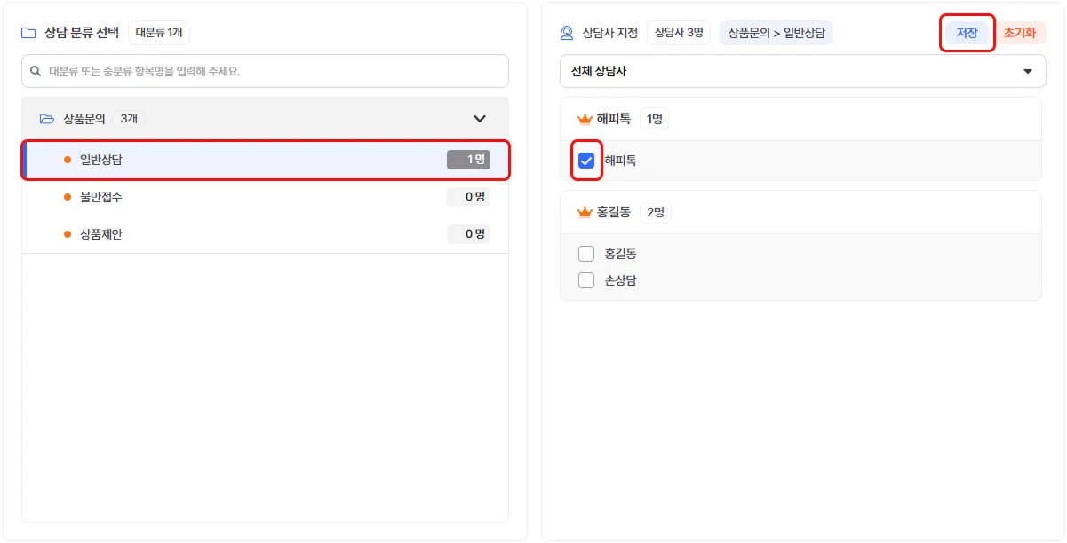 예를 들어 위 이미지에서는 중분류 '일반상담’에서 ‘해피톡’ 상담사를 지정해주었어요.