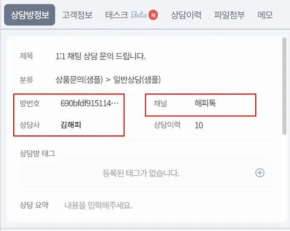 상담정보 영역은 아래와 같이 상담방 정보, 고객정보, 상담이력 3가지로 구분됩니다.