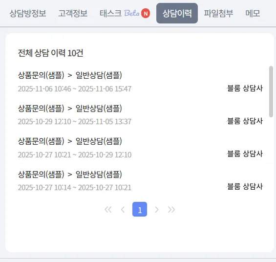 동일한 고객 ID 기준으로 과거 상담내역 자동 연동되어 표시