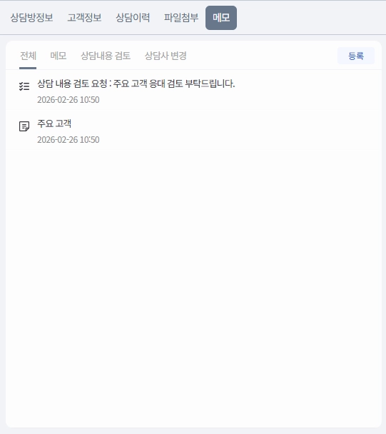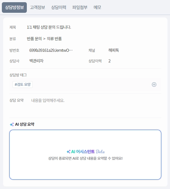 아래와 같이 상담방 정보 / 고객정보 / 상담이력 / 파일첨부 / 메모로 구성됩니다.