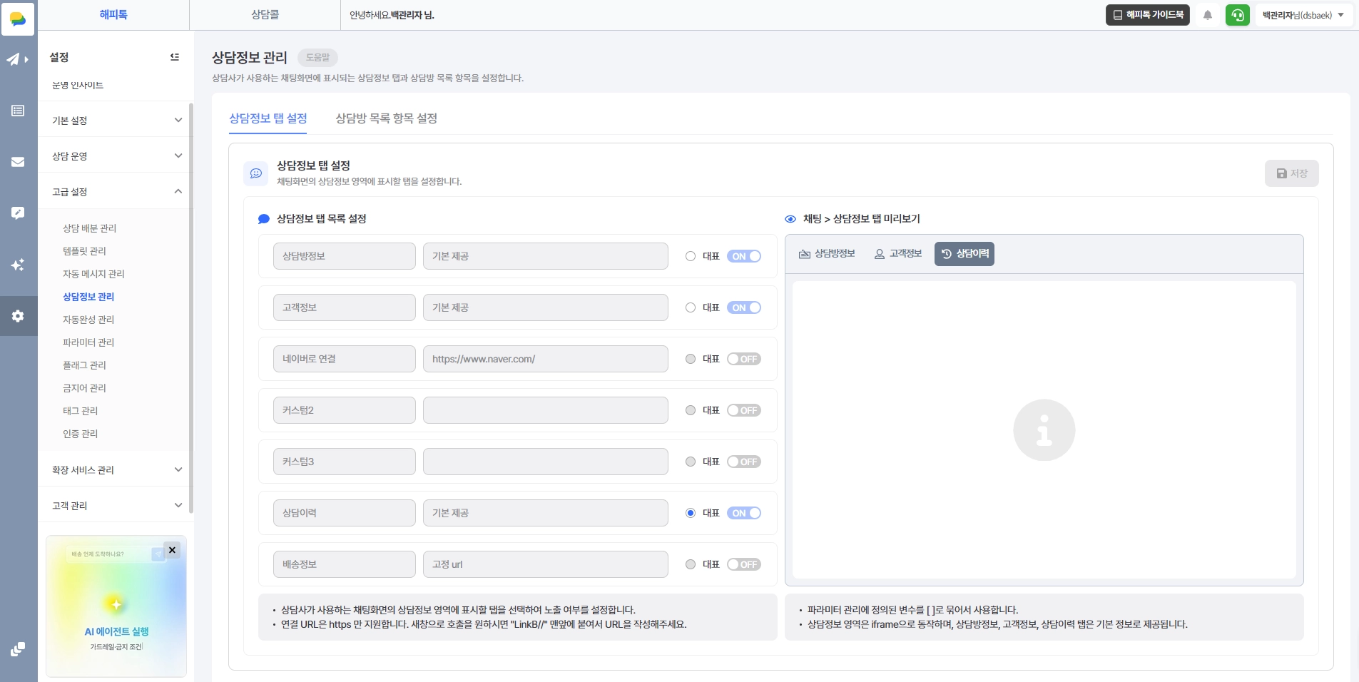 상담정보 영역의 기본 표시 탭 내 메뉴를 관리자가 지정할 수 있습니다.