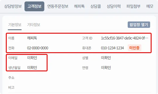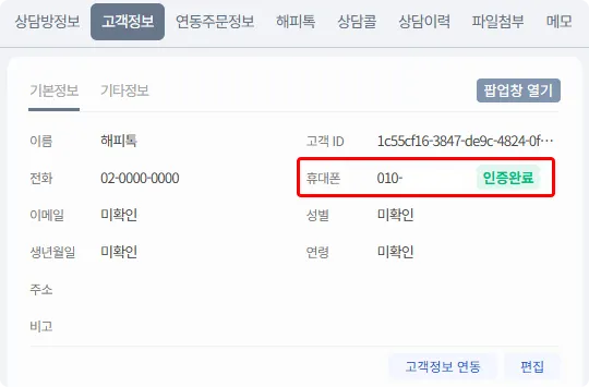 고객 정보 탭은 고객의 기본 정보, 인증 정보(SMS, 카카오싱크), 추가 정보(파라미터 정보)를 보여줍니다.
