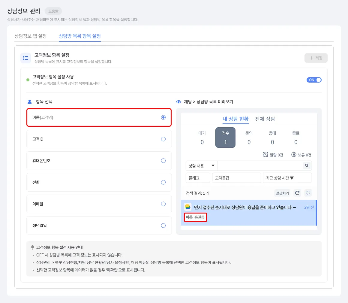 예를 들어 상담방 목록 노출 정보를 '이름' 노출로 설정한다면, 위 미리보기와 같이 고객 정보 중 '이름'이 표시됩니다.