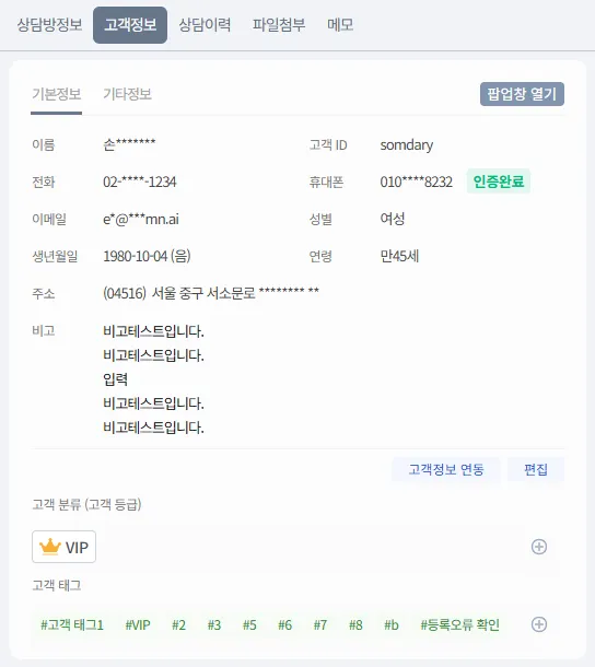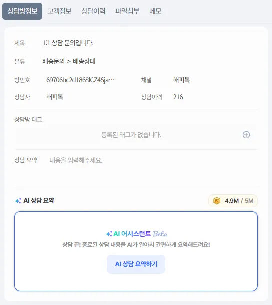 상담방 정보, 고객정보, 상담이력탭은 고정으로 제공되는 탭입니다.