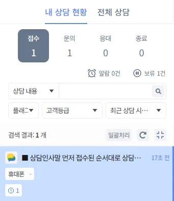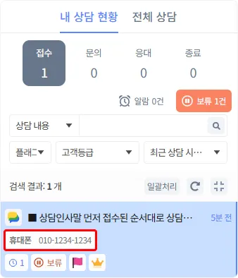 상담방 목록 노출 정보를 '휴대폰' 노출로 설정했으나, 입력된 '휴대폰'이 없는 경우 ‘-’으로 표시됩니다.