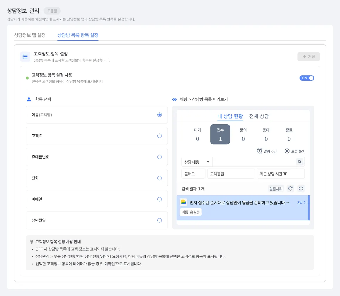 상담 목록 영역에서 어떤 고객 정보도 노출하지 않고자 하면, 'OFF'로 설정해 주면 됩니다.