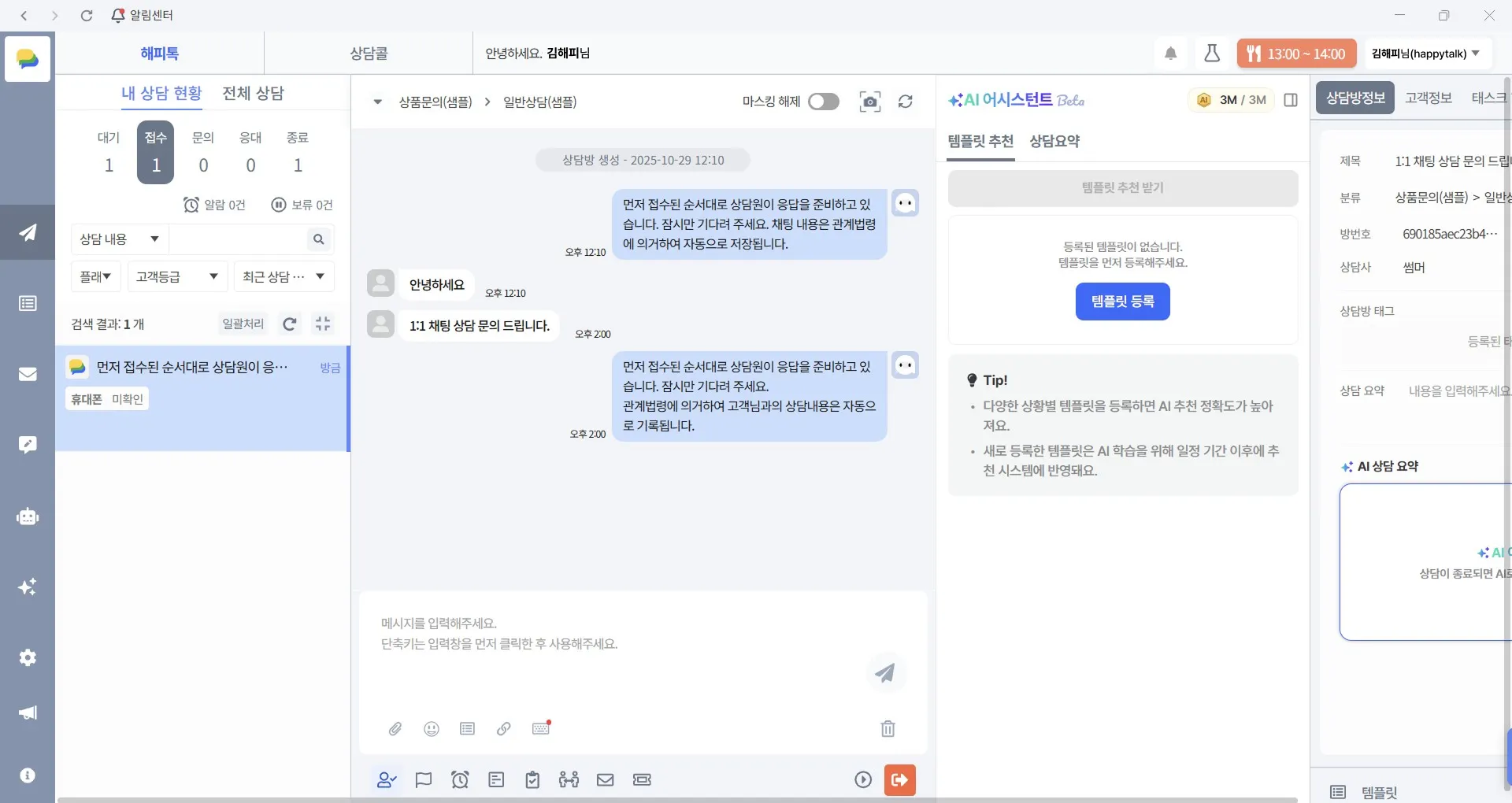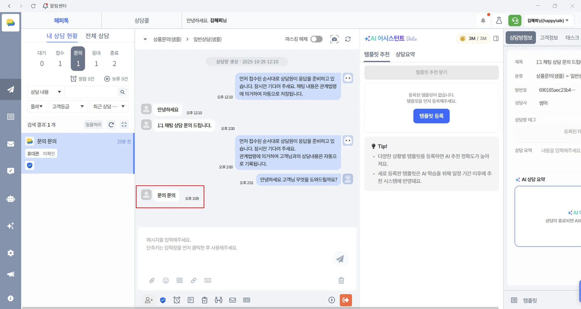 상담사가 한 차례 응대 후, 고객과 대화를 진행중인 상담방 목록