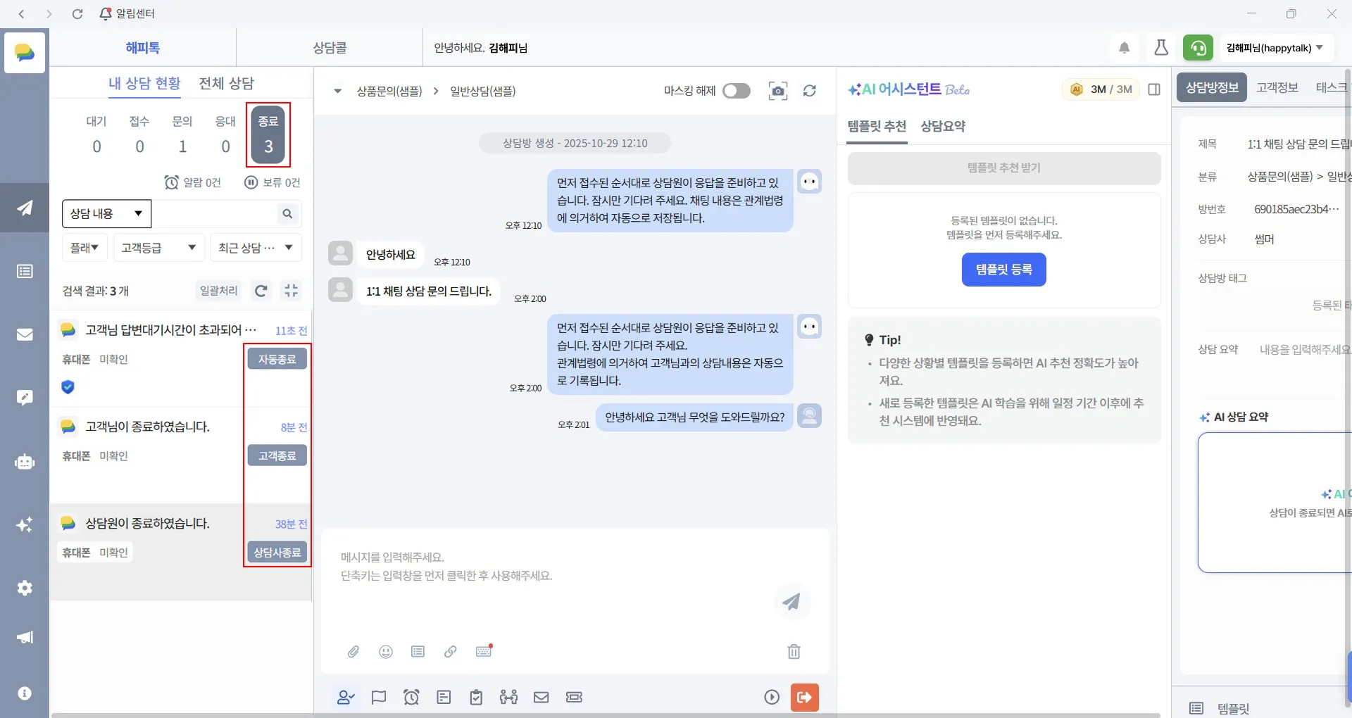 ‘자동종료,고객종료,상담사종료’ 중 어떤 방식으로 종료된 상담방인지 확인 가능
