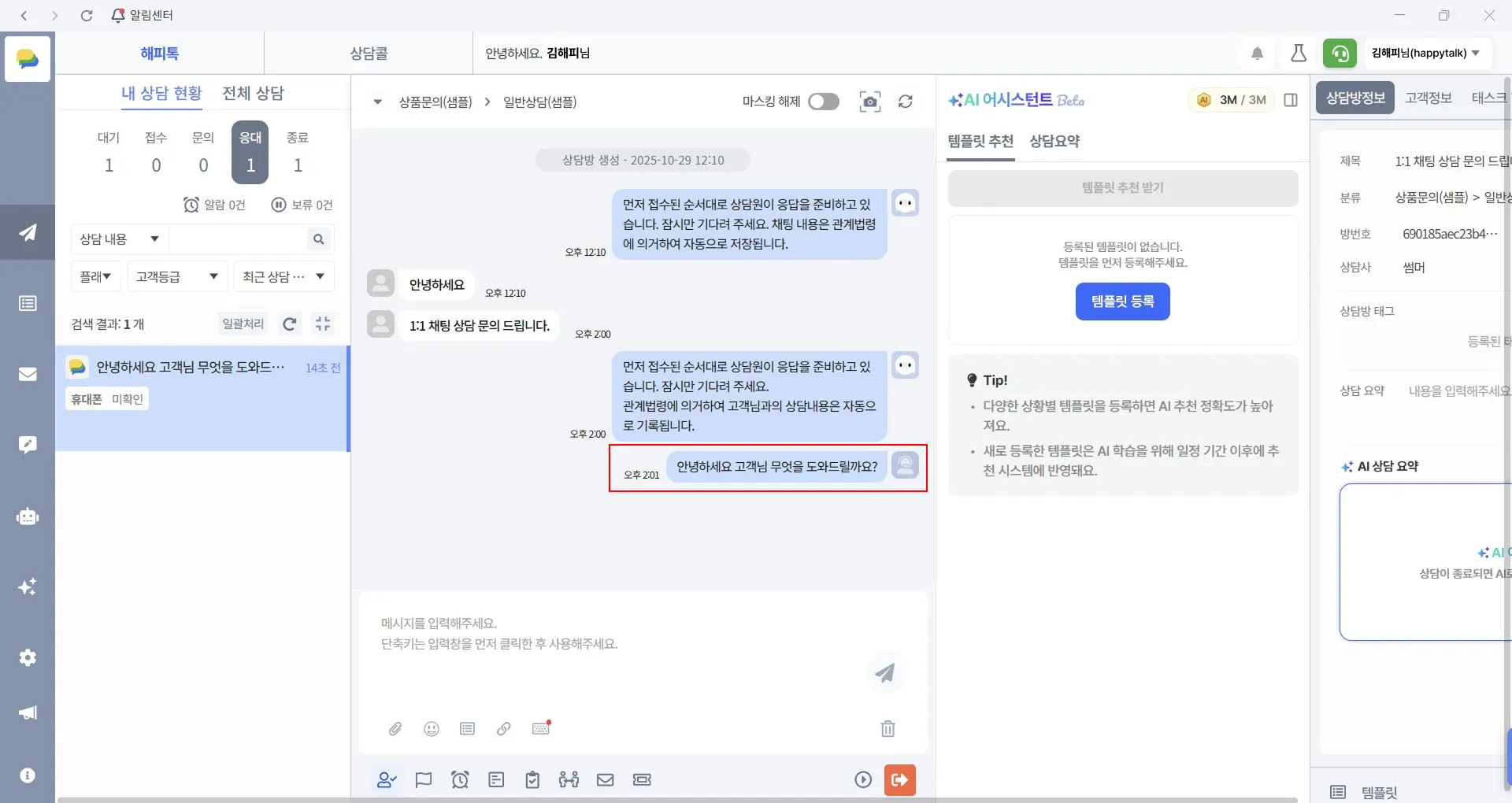 상담사가 한 차례 응대 후, 고객이 대화를 진행중인 상담방 목록