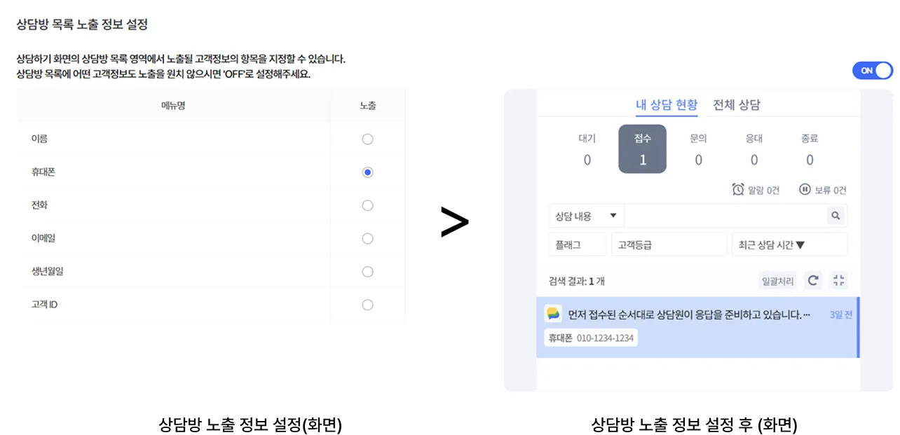 설정 → 고급 설정 → 상담정보 관리 → 상담방 목록 노출 정보 설정