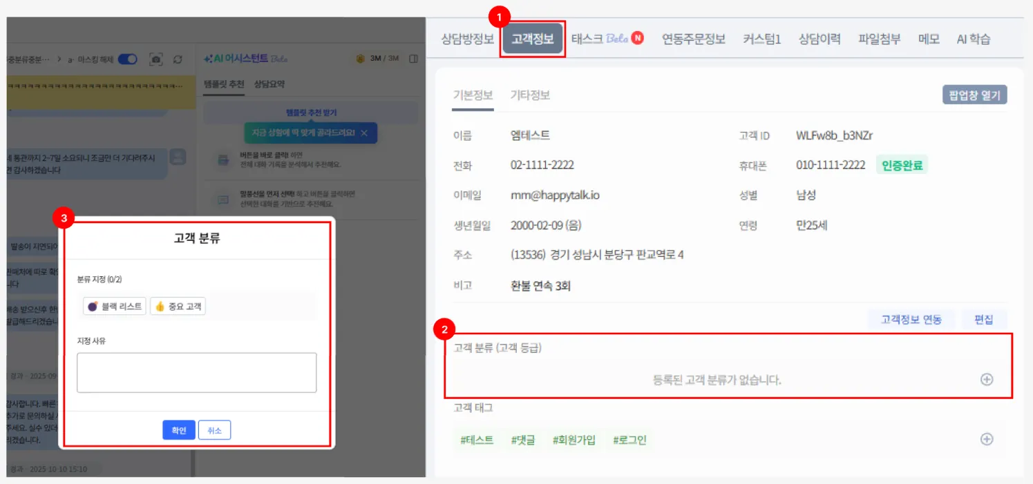 설정 방법 : [채팅] > [현재 상담 채팅] > [고객 정보] > [고객 분류(고객 등급)]