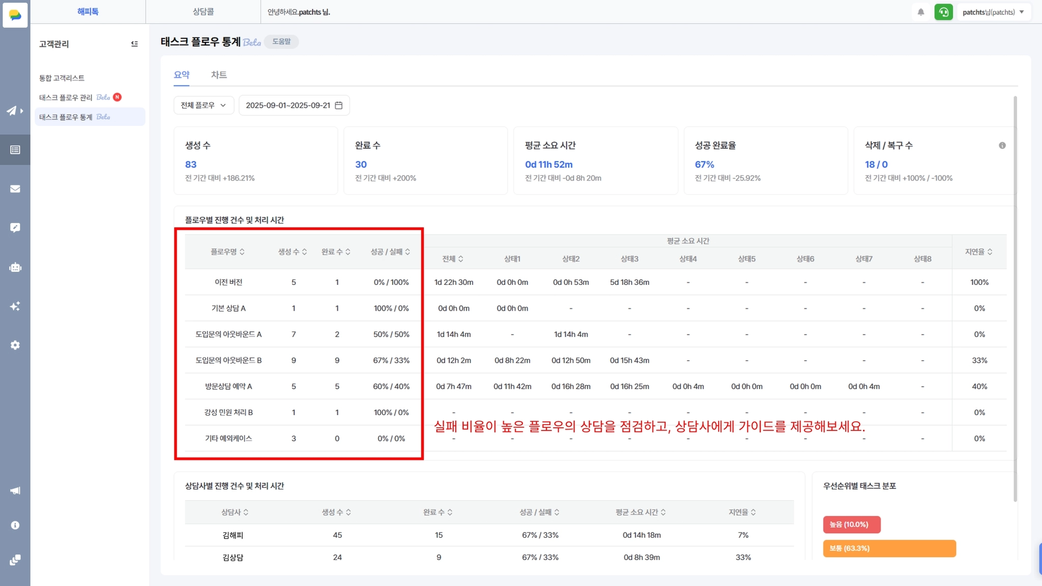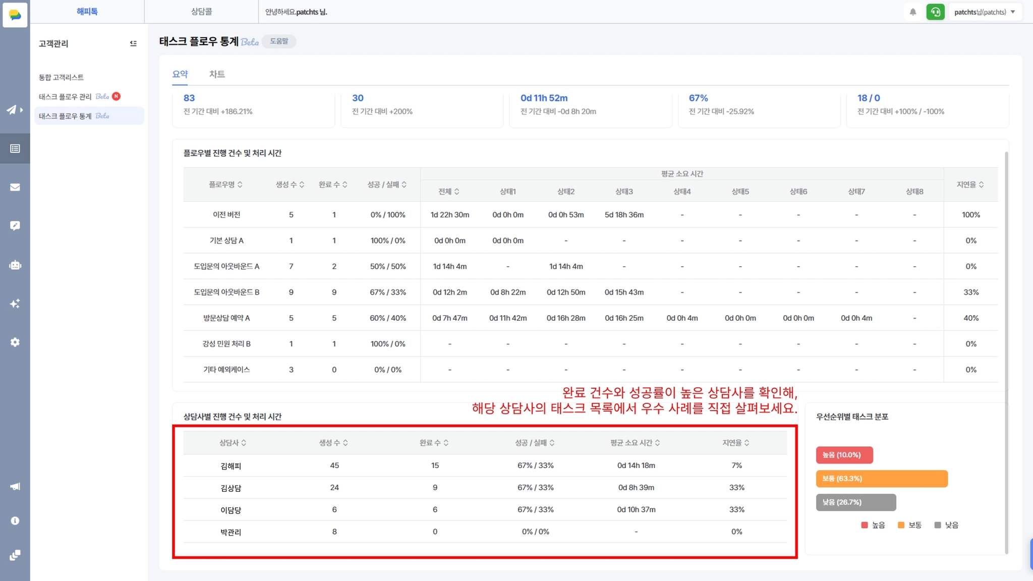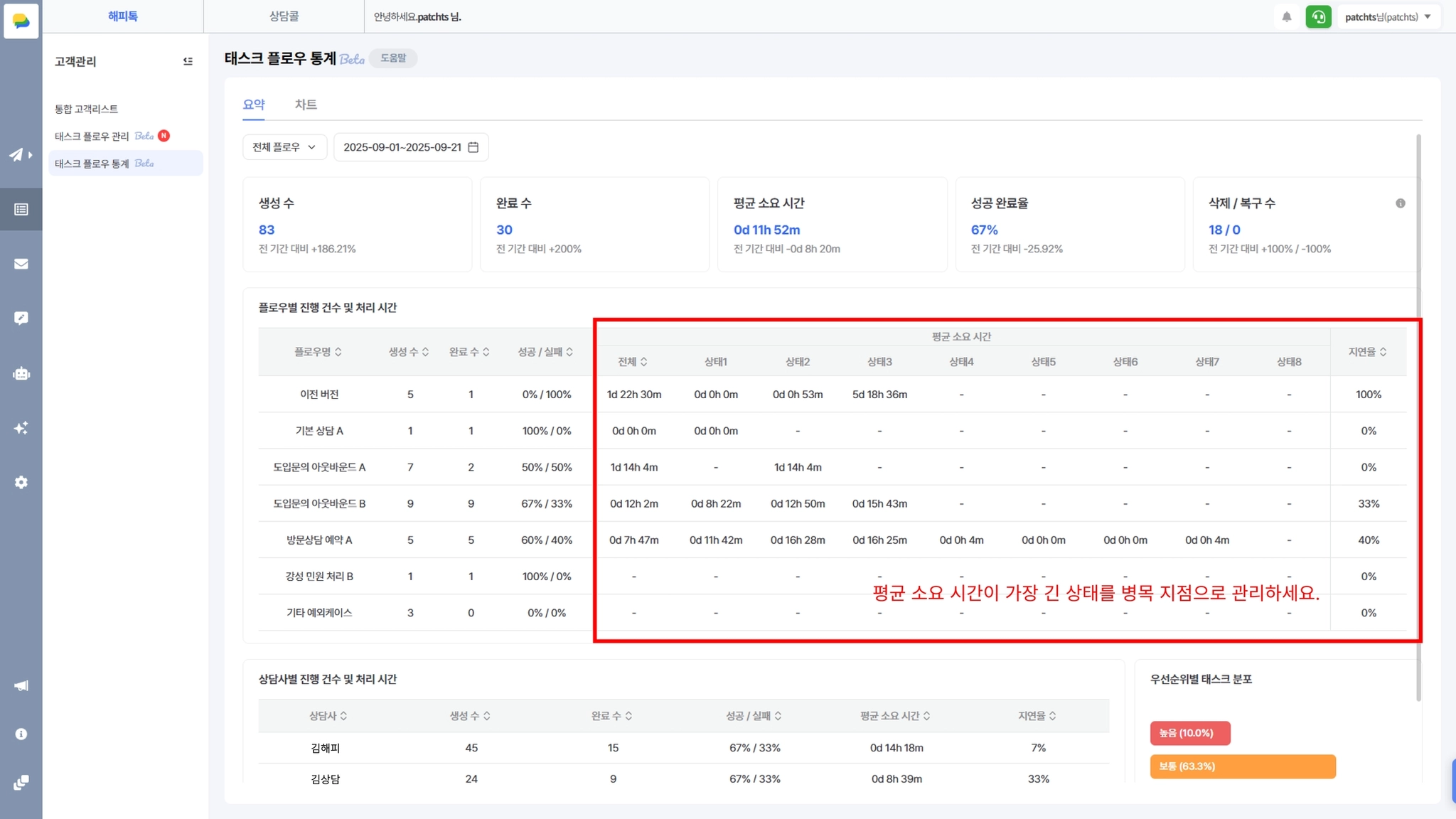 태스크 플로우 통계를 활용하면 상담 운영을 다음 관점에서 개선할 수 있습니다.