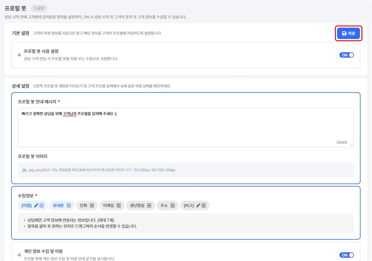 '프로필봇 안내 메시지'는, 처음 고객 인입 시 정보 입력을 요청하는 메시지입니다. 필요 시 이미지도 첨부할 수 있어요.