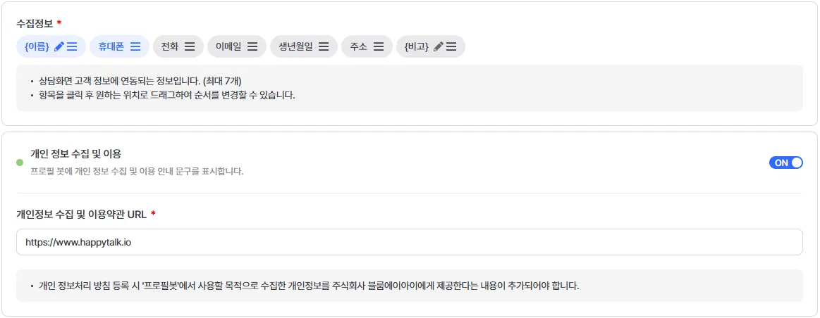프로필봇 외에 상담 중 고객이 개인정보를 입력하지 않도록 주의해 주세요.