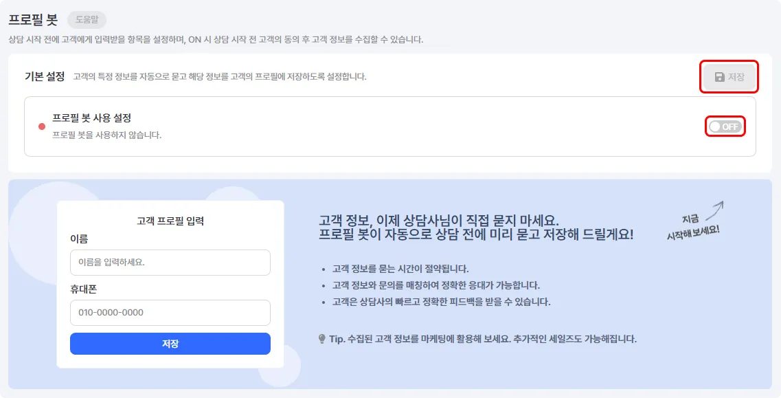 '프로필봇'은 상담 시작 전에 고객에게 개인 정보 제공 동의를 받은 후, 고객이 입력한 정보를 자동으로 고객 프로필에 저장할 수 있습니다. 더 빠르고 정확한 상담 진행이 가능해요.