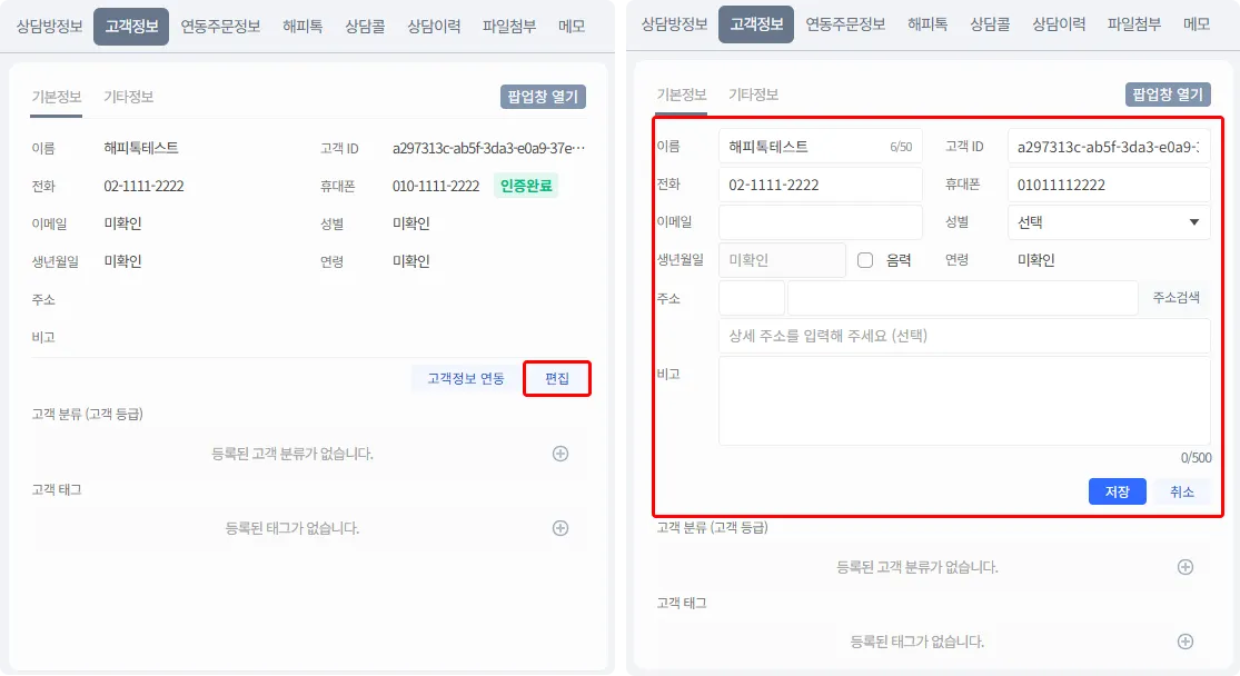 [편집] 버튼을 클릭한 후 고객 정보를 수정합니다.