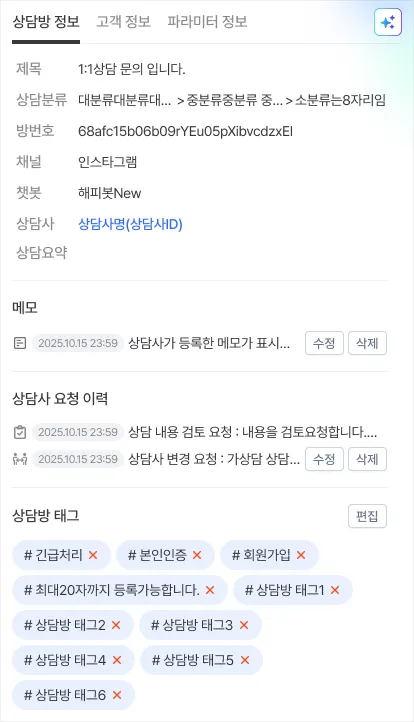 상담방의 상담 정보를 표시하며, 상담방 태그를 편집할 수 있습니다.