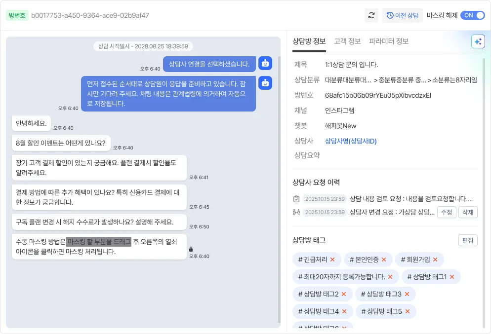 상담을 요청한 고객의 정보를 표시하며, 고객 태그를 편집할 수 있습니다. 고객 개인정보는 마스킹 처리되어 표시되며, 마스킹 해제 ON시 원문이 표시됩니다.