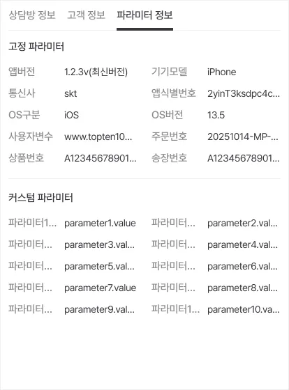 상담 인입 시 전달되는 고정 및 커스텀 파라미터에 대한 정보를 표시합니다. [설정 > 고급 설정 > 파라미터 관리]에 정의된 파라미터 정보입니다.