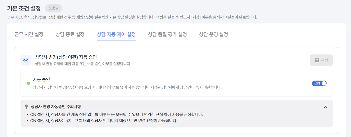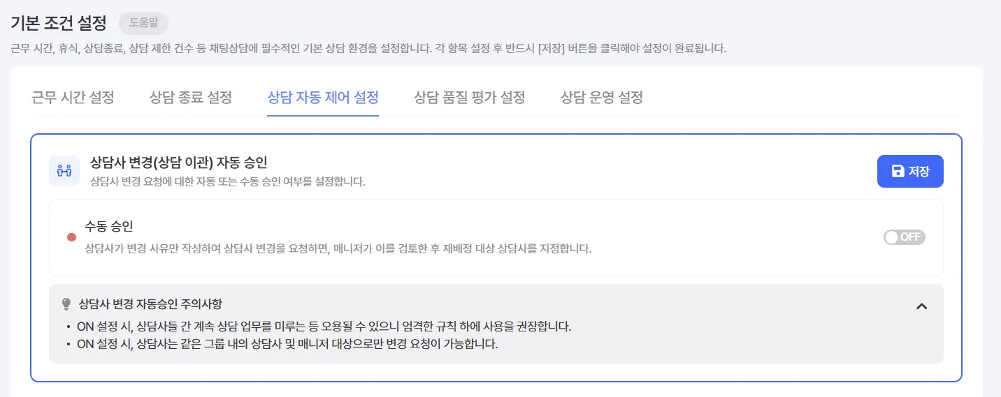 '상담원 변경 수동승인'은 다른 상담사에게 자유롭게 상담을 이관할 수 없으므로, 관리자(매니저) 승인 후 변경이 필요한 경우에 사용합니다.