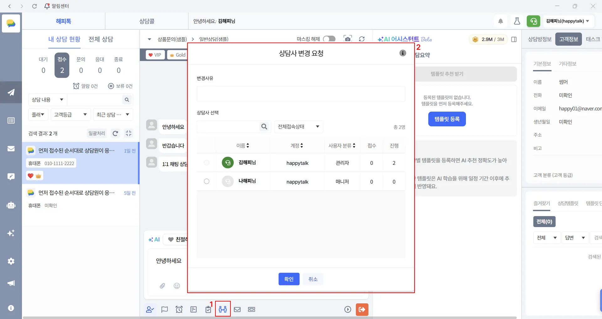 (5-24-1. 이미지 참고) 변경(재배정)을 받은 상담사는 알림을 받게 됩니다.