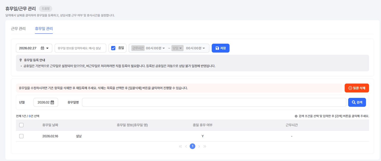 특정 상담사만 휴무인 경우에는 전체 휴무일 등록이 아닌 상담사 배정 화면에서 개별 설정하는 것이 적절합니다.