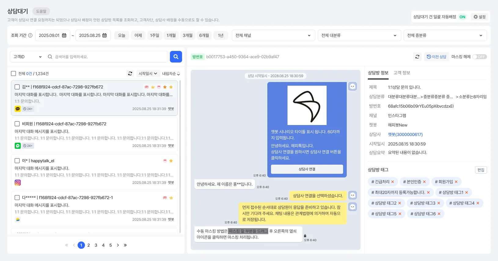상담을 요청한 고객의 정보를 표시하며, 고객 태그를 편집할 수 있습니다. 고객 개인정보는 마스킹 처리되어 표시되며, 마스킹 해제 ON시 원문이 표시됩니다.