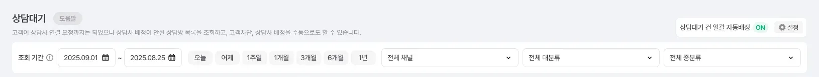 근무시간 외, 휴식 중 등의 사유로 배정되지 않은 상담 대기 건이 있을 경우, 상담 가능 상담사가 발생하면 해당 건을 일괄 자동 배정하는 기능입니다.